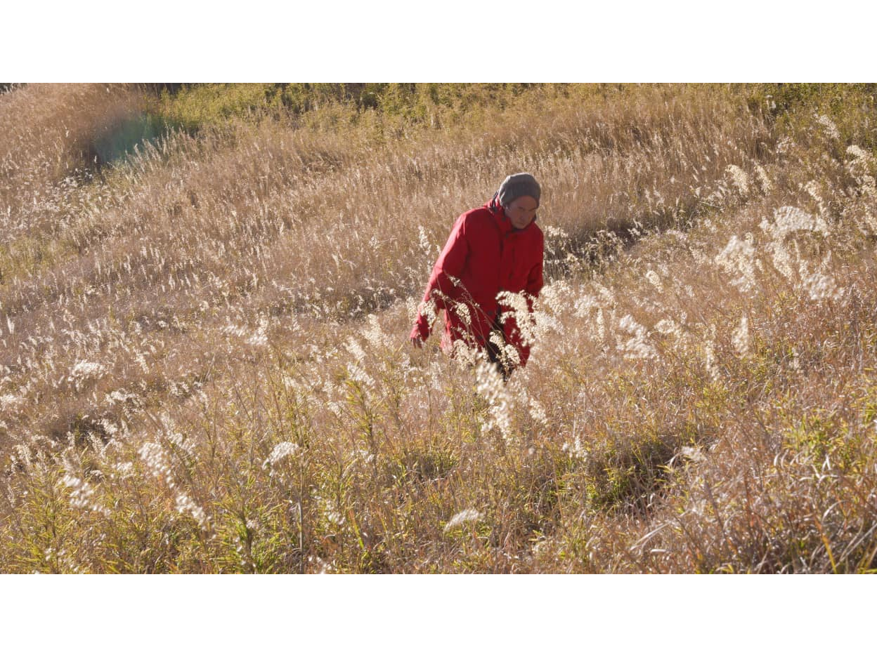 我把紙本簡介交到她手裡, 封面是一張阿共獨自行走在高山芒草推上的照片。 搖曳的草海, 孤獨的背影, 姊姊才剛看見, 淚水汨汨而下, 心疼弟弟走過的顛簸與坎坷。